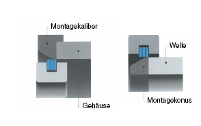 Sind vorgeschriebene Montagefasen am Gehäuse oder an der Welle aus verengten Platzgründen nicht möglich, dann sind für Gehäuse aufsetzbare Montagekaliber und Montagebänder und für Wellen vorgesetzte, abnehmbare Montage- konuse hilfreich.